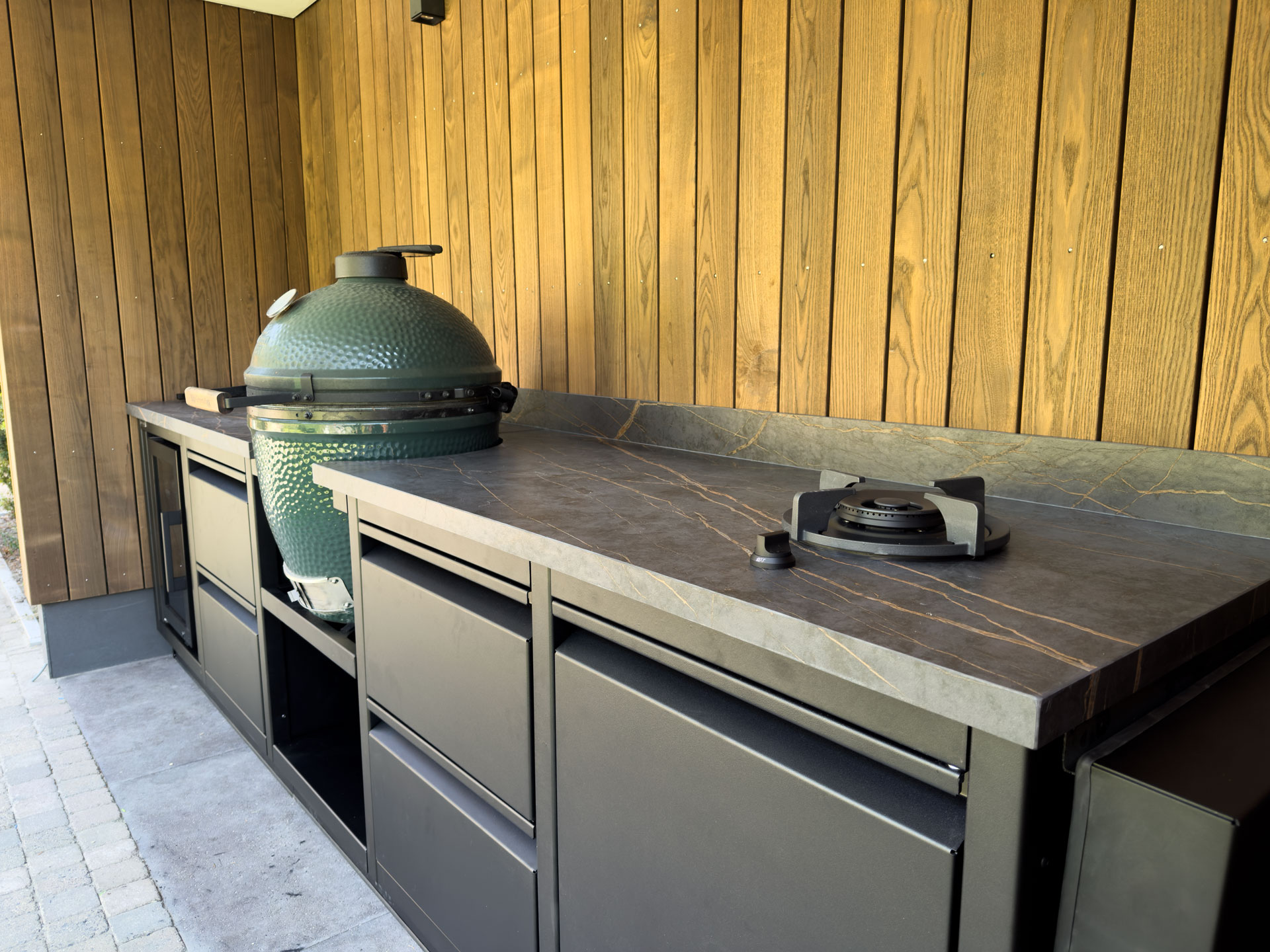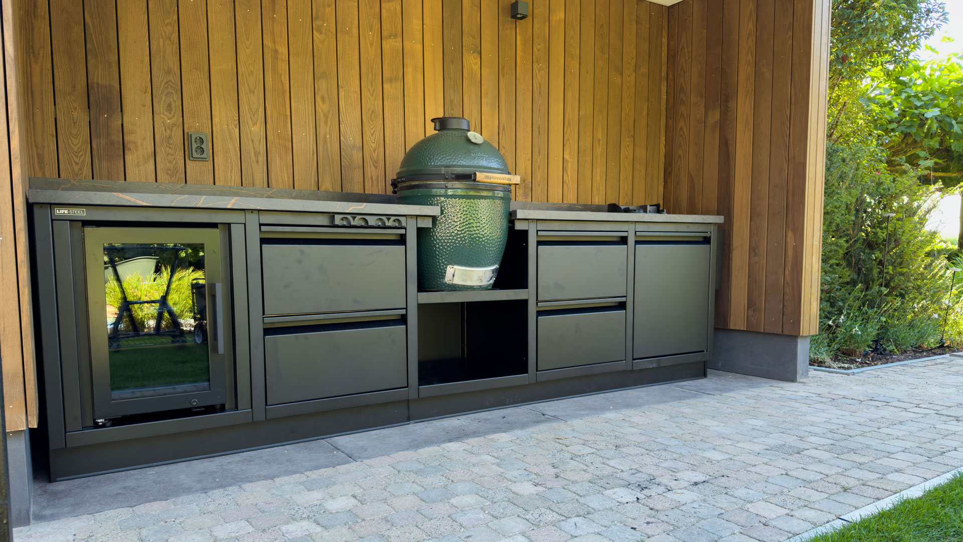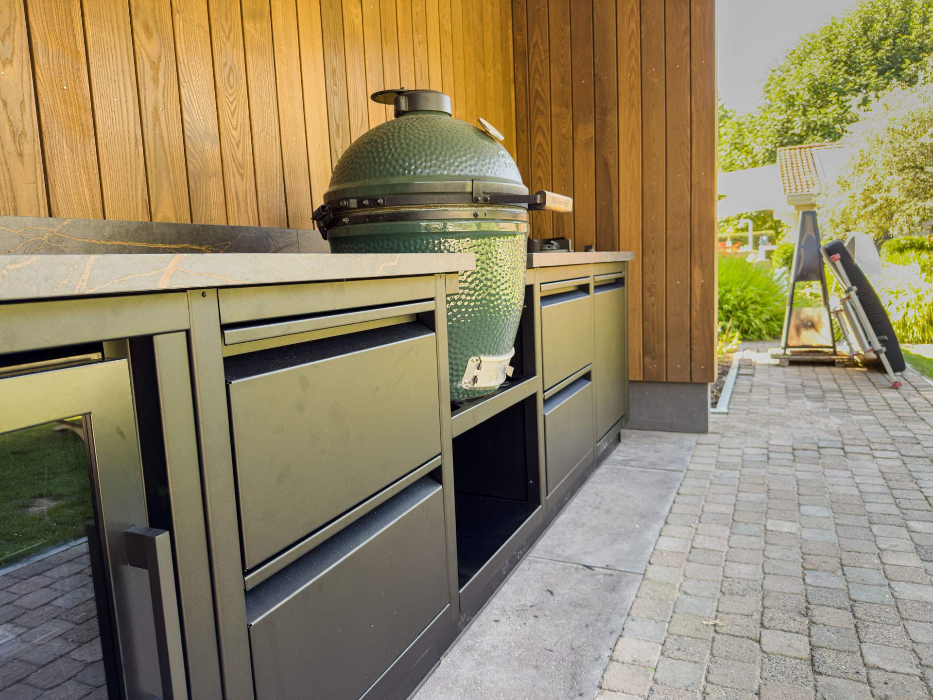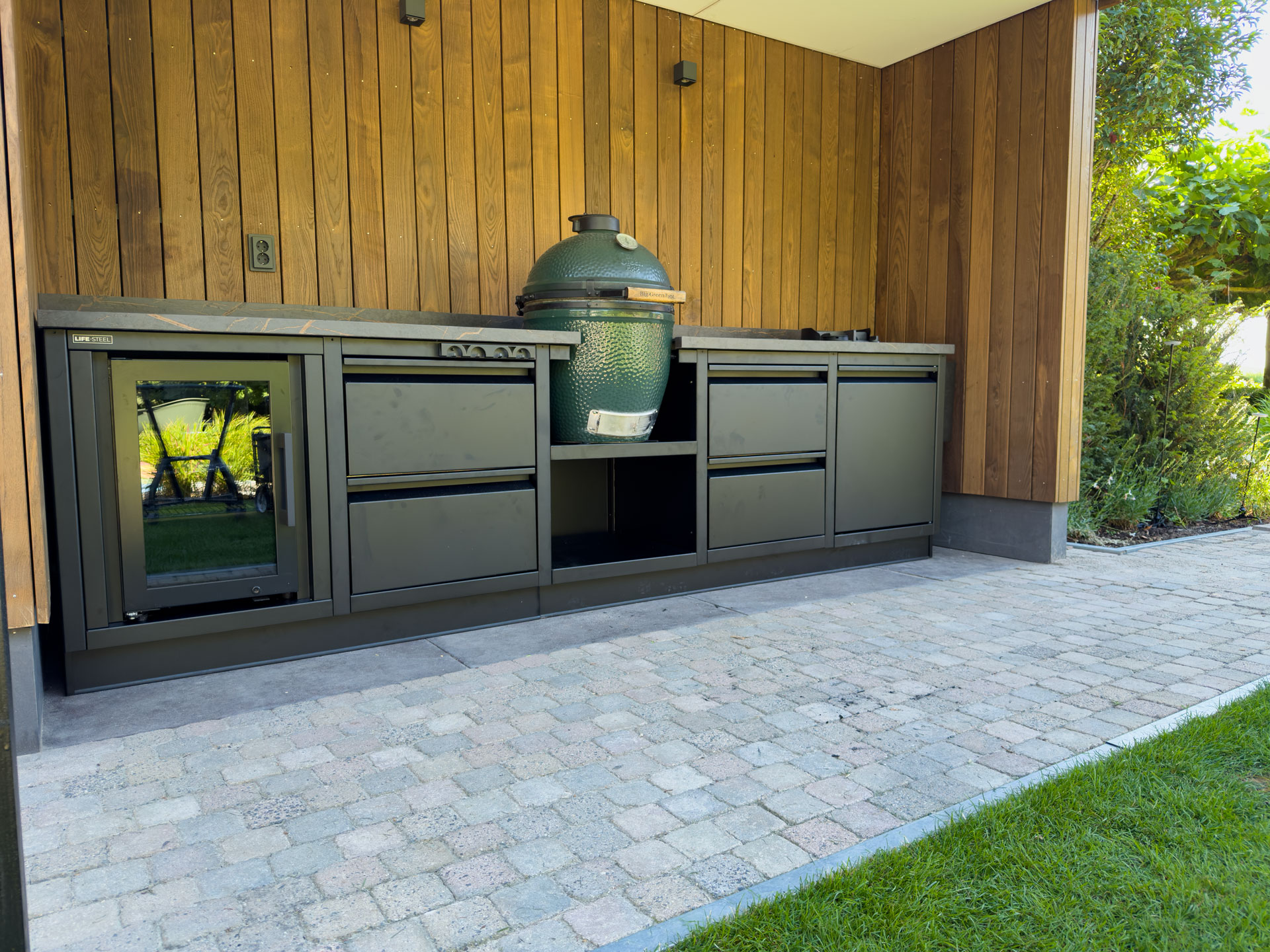Deze buitenkeuken hebben we mogen plaatsen bij een echte barbecueliefhebber. Gecentreerd in de keuken staat de Big Green Egg, de eyecatcher van deze keuken. Links en rechts van de Big Green Egg is voldoende opslagruimte voor alle roosters, hitteschilden en andere accessoires door middel van dubbele lades. Daarnaast zijn de lades nog voorzien van een binnenlade voor gereedschap zoals barbecue tangen, aanstekers en ander klein gereedschap.